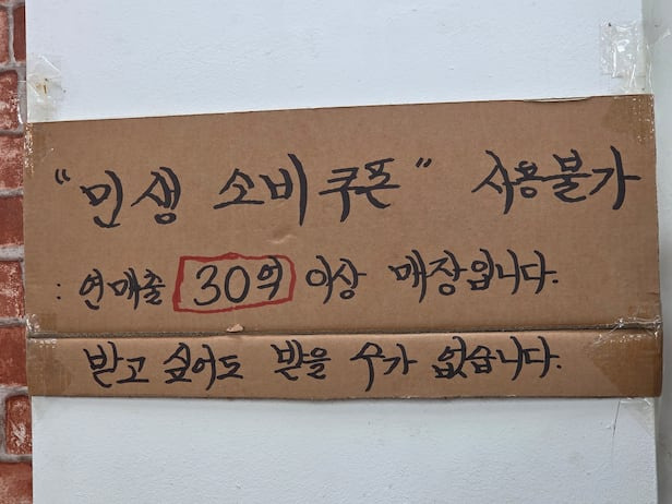 이는 “민생 소비 쿠폰 사용 불가, 연 매출 30억 이상 매장입니다” 하는 안내문 때문이다. 옆에는 ‘신용카드 수수료가 부담스럽다’는 취지로 “3000원 이하는 현금 결제 부탁합니다”라는 오래된 호소문도 붙어 있었다.