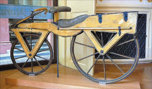 19세기 초 제작된 초기 자전거인 드라이지네의 모습. 방향을 바꿀 순 있었지만, 페달이 없어 발을 구르며 타야 했죠. /위키피디아