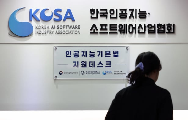 플랫폼 기업 해이도 경계를AI 기본법 시행 첫날인 지난 1월 22일 서울 서울 송파구 한국인공지능·소프트웨어산업협회 출입구에 인공지능기본법 지원데스크 현판이 걸려있다. /뉴시스