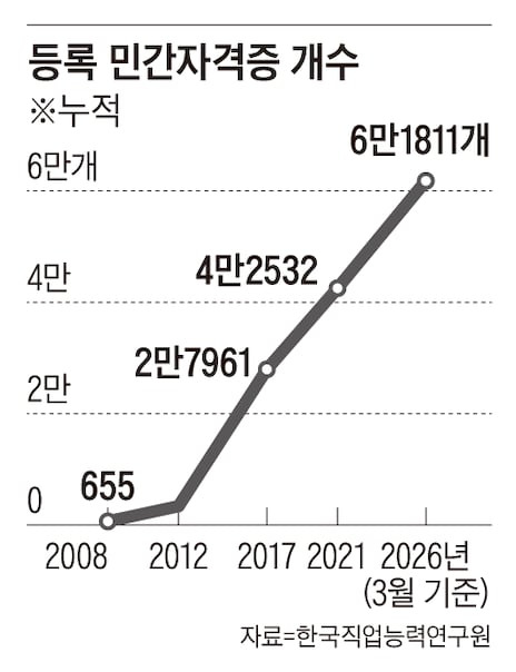 한국직업능력개발원에 따르면 현재 1만7520개 기관이 6만1811종의 민간자격을 등록했다. 매년 5000~6000개가 새로 생겨나고 2000여개가 사라진다. 작년엔 역대 최다인 7369개가 등록됐다.