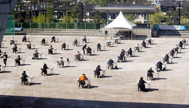 코로나 사태 당시 야외에서 열린 보험설계사 자격증 시험. /조선일보DB